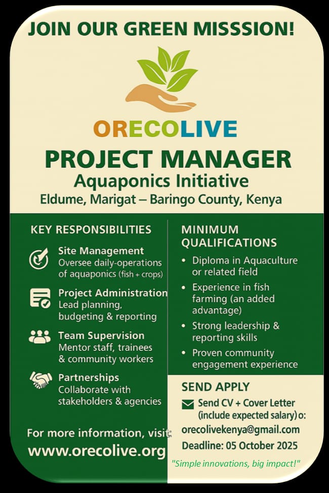 Apply now by sending your CV and coverletter to: orecolivekenya@gmail.com with the subject line “Application”